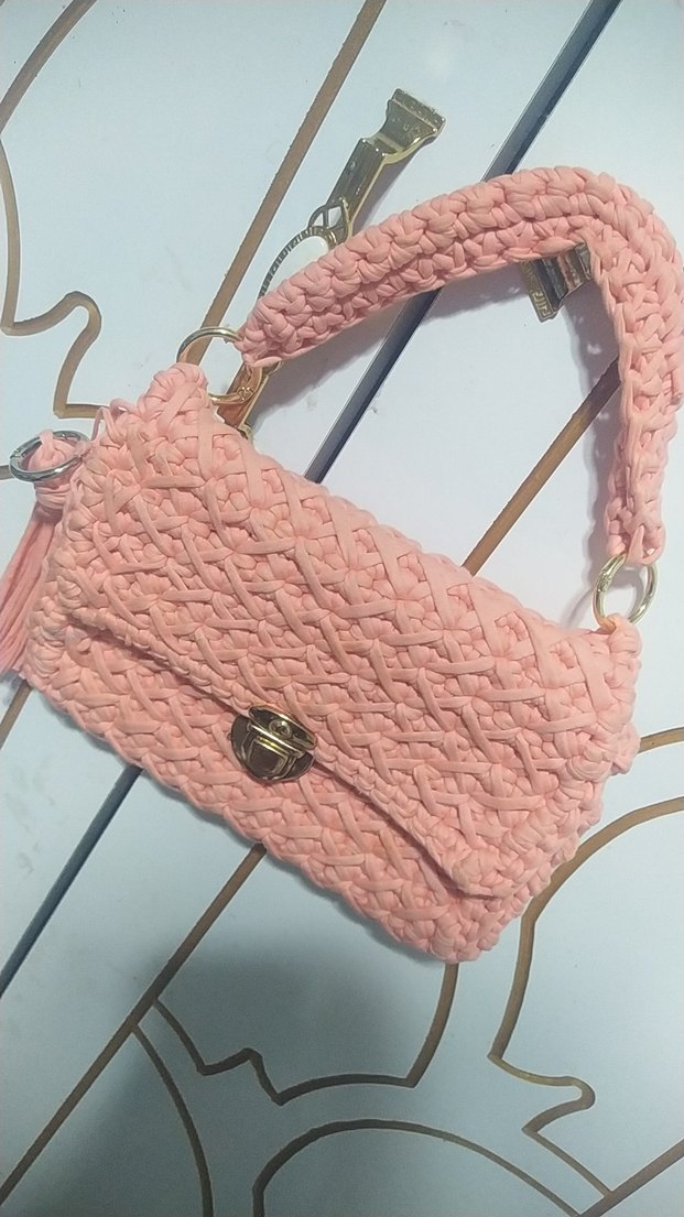 Pembe renkli, örgü dokulu kadın çanta. Bohem tarzıyla günlük kullanıma uygun, yumuşak ve rahat bir görünüm sunar.