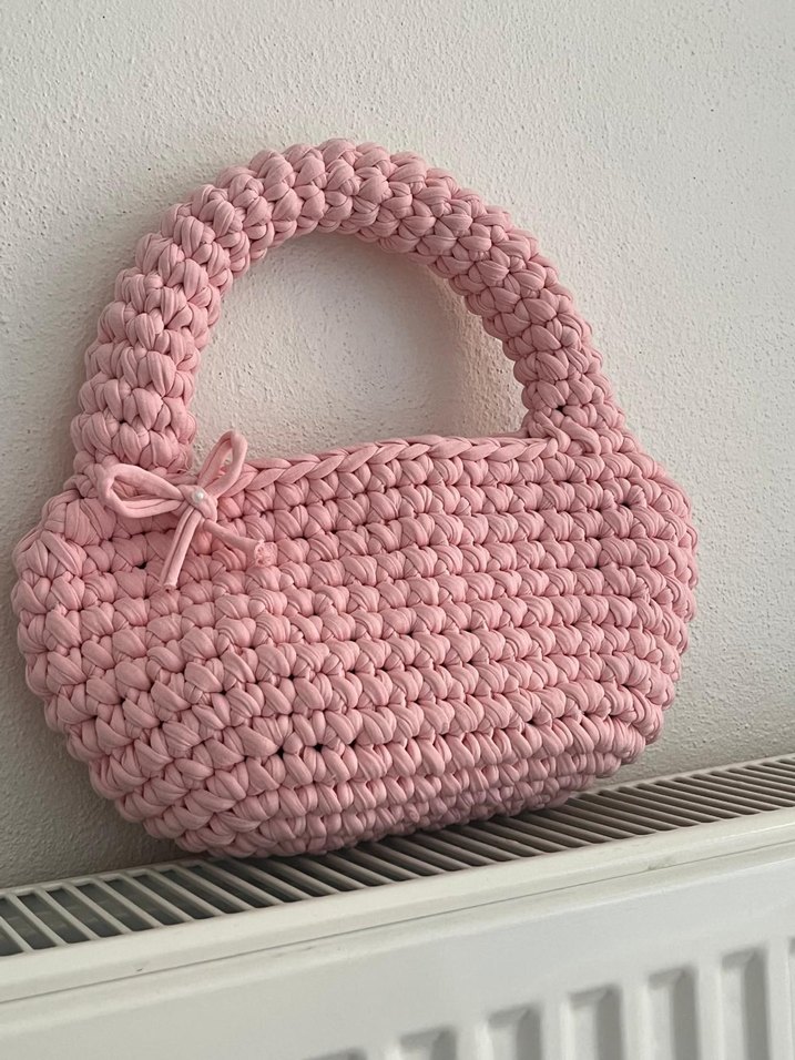 Yumuşak pembe örgü kadın el çantası, sade ve desensiz tasarımıyla günlük kullanıma uygun. Pastel tonları ve temel normcore stiliyle uyumlu.