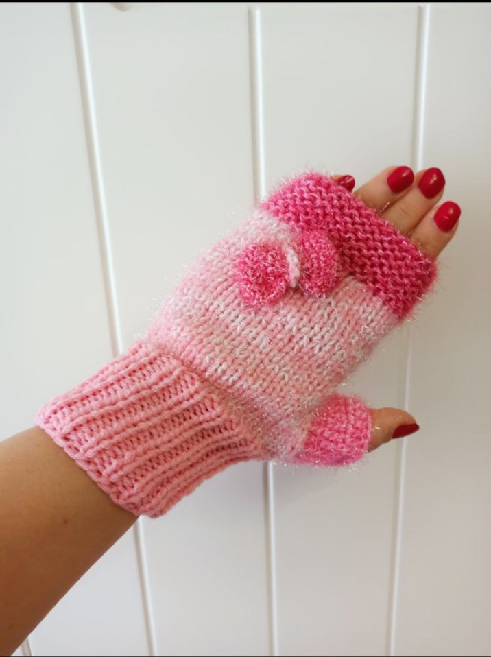 Renkli pembe örgü kadın eldiven, yumuşak dokusu ve süslü ponponuyla rahat bohem tarz sunar.