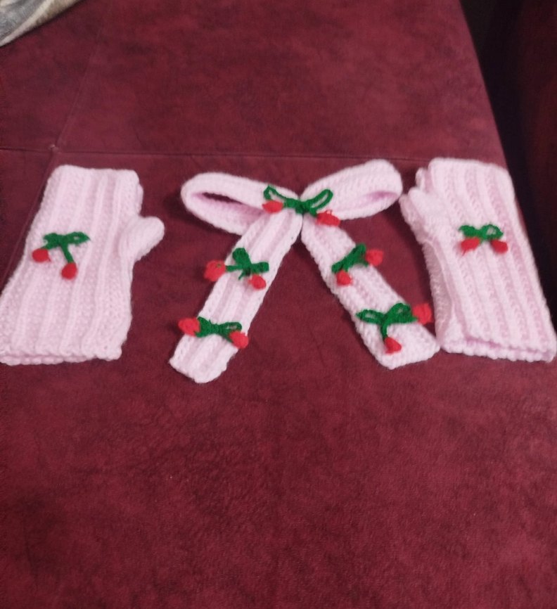 Pembe örgü kadın eldiven ve küçük kırmızı-yeşil detaylarla süslenmiş boyunluk seti, sıcak ve renkli bir görünüm sunar.