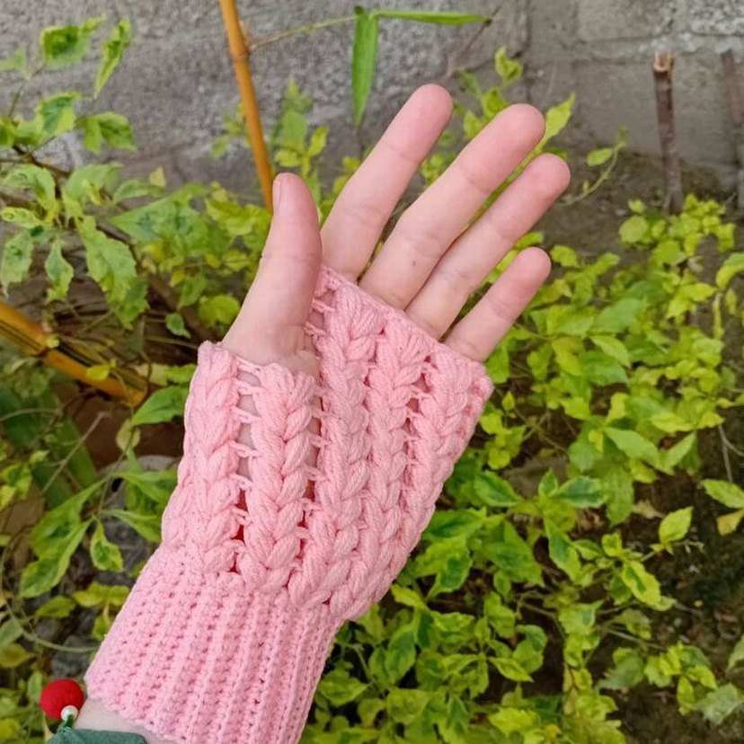 Pembe örgü, bohem tarzda kadın eldiveni. Rahat ve renkli tasarımıyla parmakları açık örgü eldiven, retro hippie görünüm için uygun.