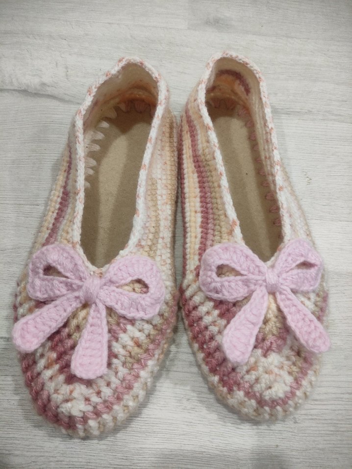 Pembe tonlarında örgü kadın ev terliği, konforlu ve klasik tasarıma sahip, fiyonk detaylı ve düşük dolgu topuklu. Günlük kullanım için uygundur.