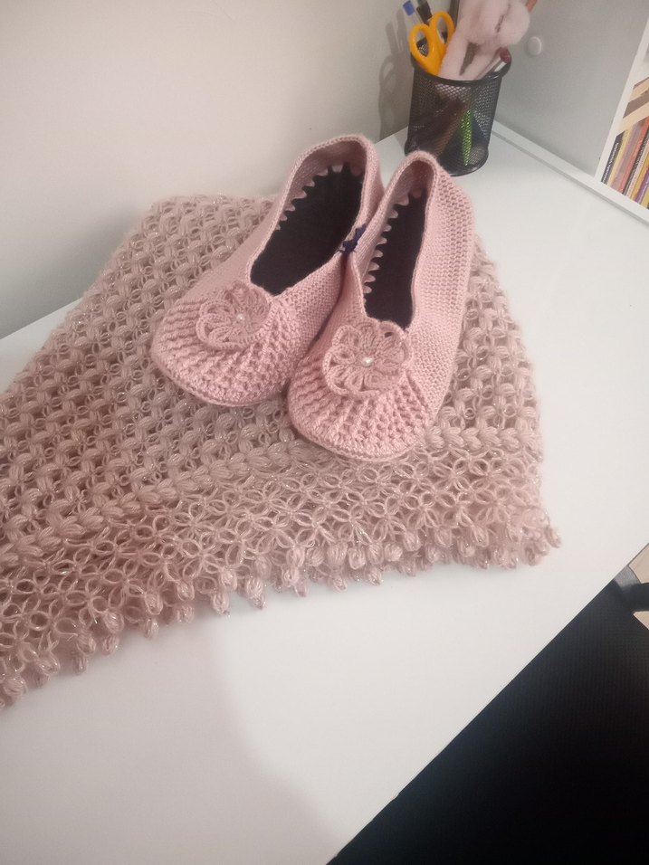 Yumuşak dokulu, üstü çiçek detaylı pembe örgü kadın ev terliği, günlük kullanım için uygun.