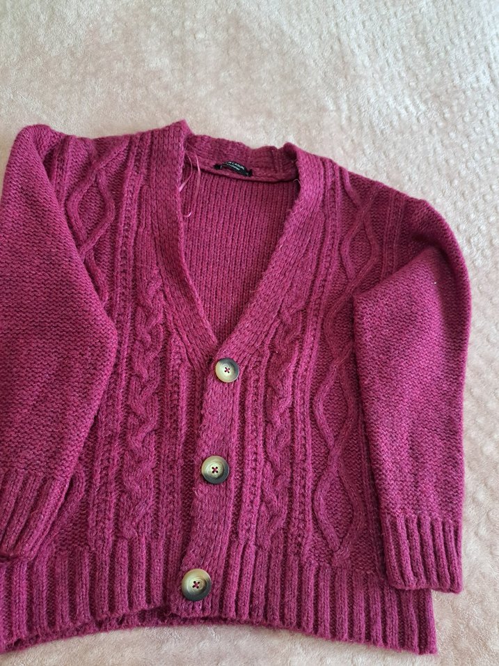 Pembe renk, örgü ve bol kesim kadın hırka. Uzun kollu, yakası notlu ve düğmeli tasarıma sahiptir, günlük kullanıma uygundur.