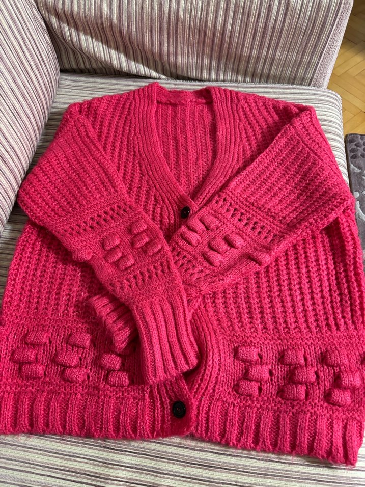 Bu pembe örgü kadın hırka, bol kesim ve uzun kollu, dokulu desenlere sahip, rahat ve renkli bohem tarz sunar. V yaka ve düğmeli, günlük kullanıma uygundur. Çok az kullanıldı. M bedene uygundur.