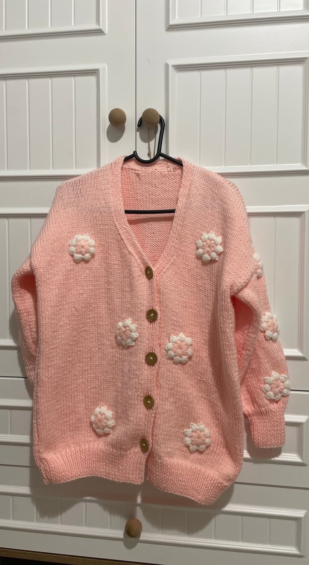 Pembe renkli, uzun kollu, rahat kesim örgü kadın hırka. Notlu yakası ve yumuşak beyaz çiçek detayları bulunur. Bohem ve retro tarzına uygundur. El emeği örüp satıyorum