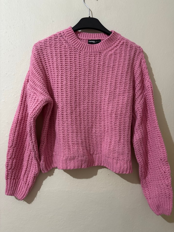 Pembe örgü kadın kazak, uzun kollu ve yuvarlak yakalı, bol kesim ve yumuşak örgü kumaştan. Pastel tonu ve desensiz yapısıyla günlük rahat sokak stiline uygundur.