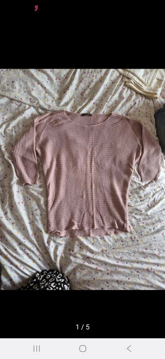 Pembe renkli, uzun kollu, yuvarlak yakalı ve bol kesim örgü kadın kazak, rahat ve günlük kullanım için uygundur. Önü bir tık daha kısa oversize bir kazak en sondaki fotoğrafta da göründüğü gibi önünde ufak bir ip kaşığı var onun dışında bir sıkıntısı yok