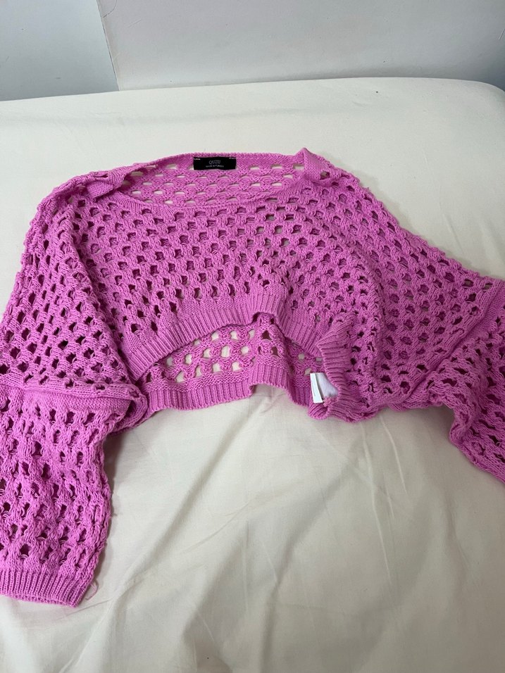Pembe, örgü kumaştan üretilmiş, kısa kollu, yuvarlak yaka ve bol kesime sahip rahat bir kadın kazak. Pastel tonları ve delikli dokusu, bohem tarzıyla günlük kullanıma uygun.