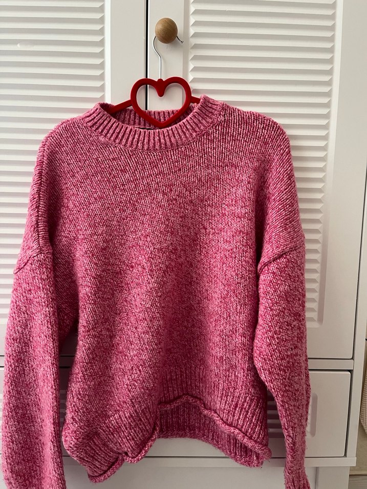 Pembe renkli, örgü kumaştan yapılmış, yuvarlak yakalı ve uzun kollu kadın kazak, rahat ve bol kesimlidir.