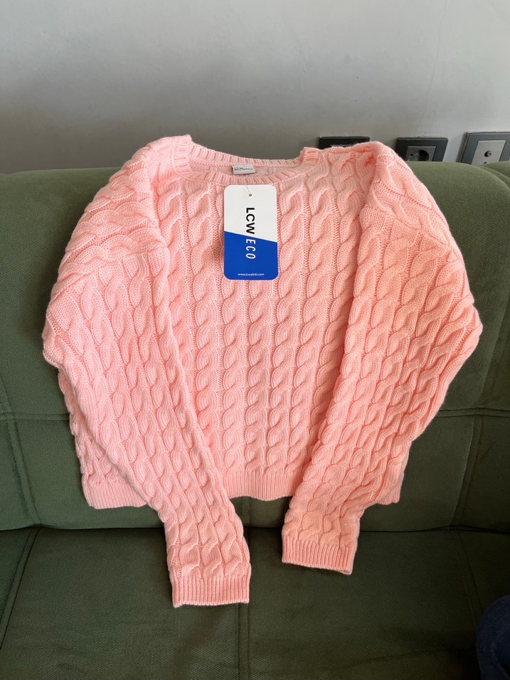 Pembe renkli, uzun kollu örgü kazak. Salaş kesim, normal boyda ve bisiklet yaka. Günlük sokak stiline uygun, sade ve rahat bir tasarım.