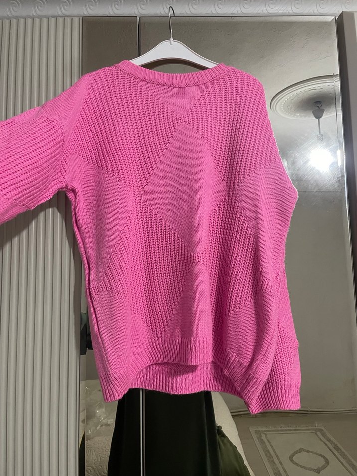 Pastel pembe renkli, örgü kumaştan yapılmış, yuvarlak yakalı ve uzun kollu kadın kazak. Rahat kesimi ve normal boyu ile günlük kullanıma uygundur.