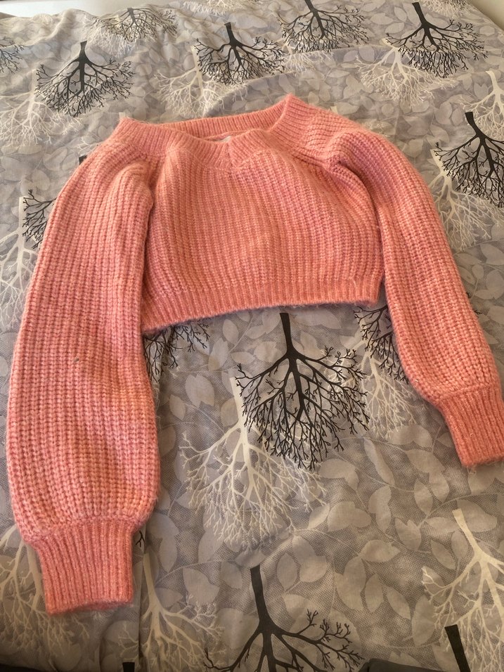Pembe renkli, örgü kumaştan yapılmış kadın kazak. Uzun kollu, yuvarlak yaka, bol kesim ve midi boyda, rahat günlük kullanım için uygundur.