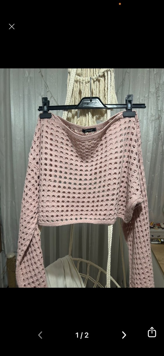 Pembe renkli, uzun kollu, salaş kesim ve kayık yaka örgü mini triko kazak. Rahat ve günlük kullanıma uygun bir sokak stili parçası.