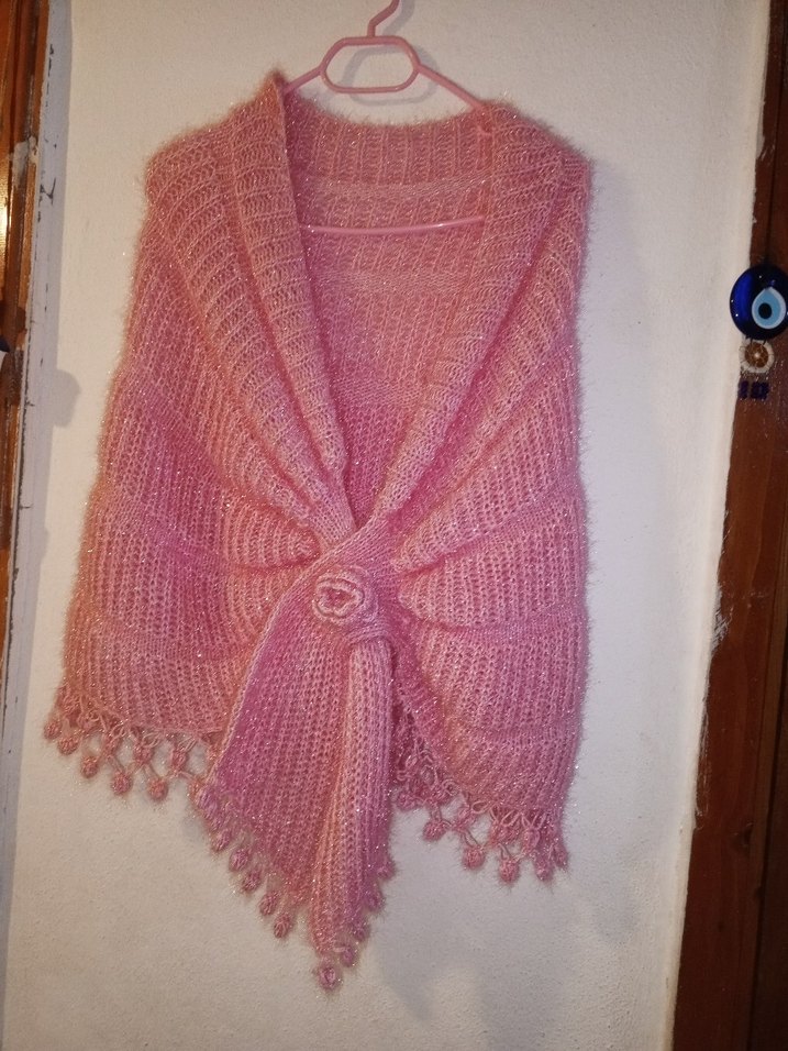 Pembe örgü kadın panço, yumuşak dokusu ve dekoratif püskülleriyle rahat ve bohem tarz sunar. Retro ve hippie görünüme uygundur.