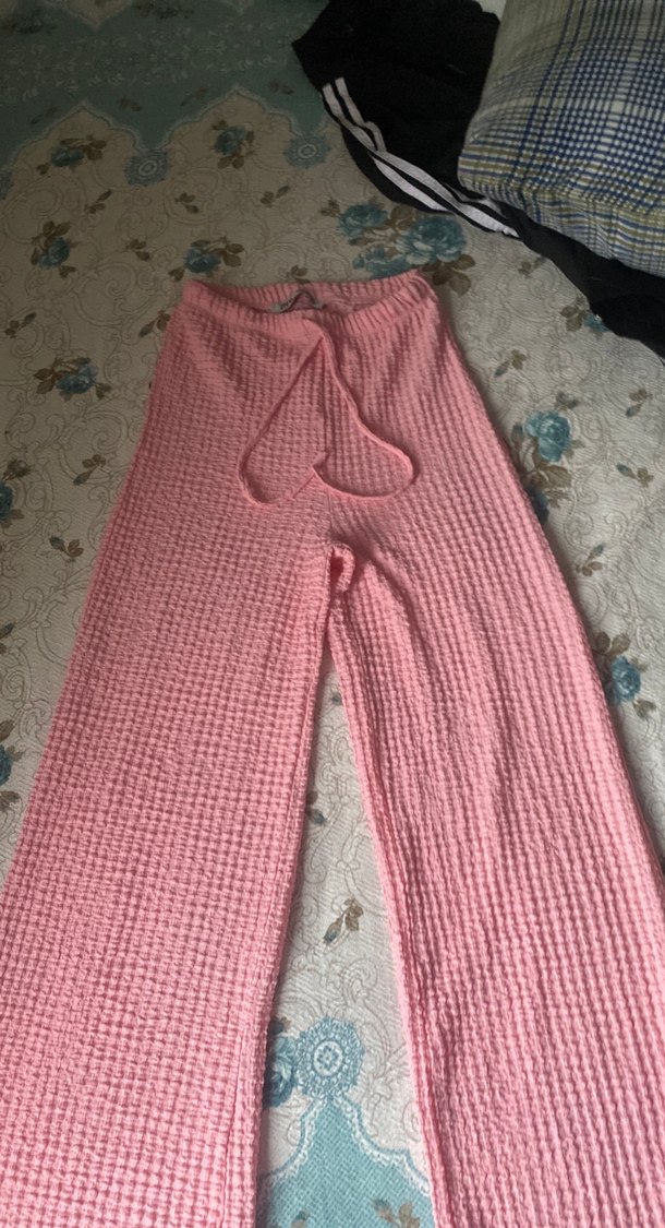 Pembe renkli, yumuşak örgü kumaştan uzun ve rahat kesim kadın pantolon. Günlük kullanıma uygun, bohem sokak stiliyle uyumlu. Hiç giyilmedi defosu yoktur