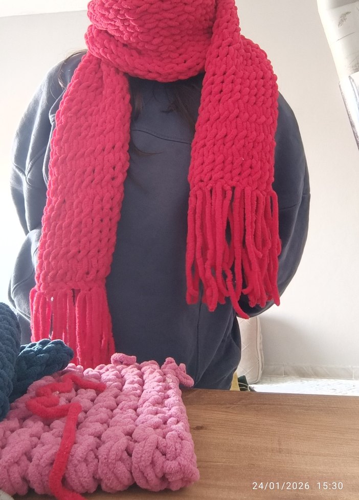 Renkli pembe örgü kadın şal, püskül detaylı, rahat ve bohem tarzda, sıcak tutar ve şıklık katar.
