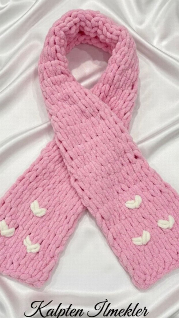Pembe renkli, örgü dokulu kadın şalı, yumuşak ve rahat dokusuyla sade beyaz kalp detaylarına sahiptir.