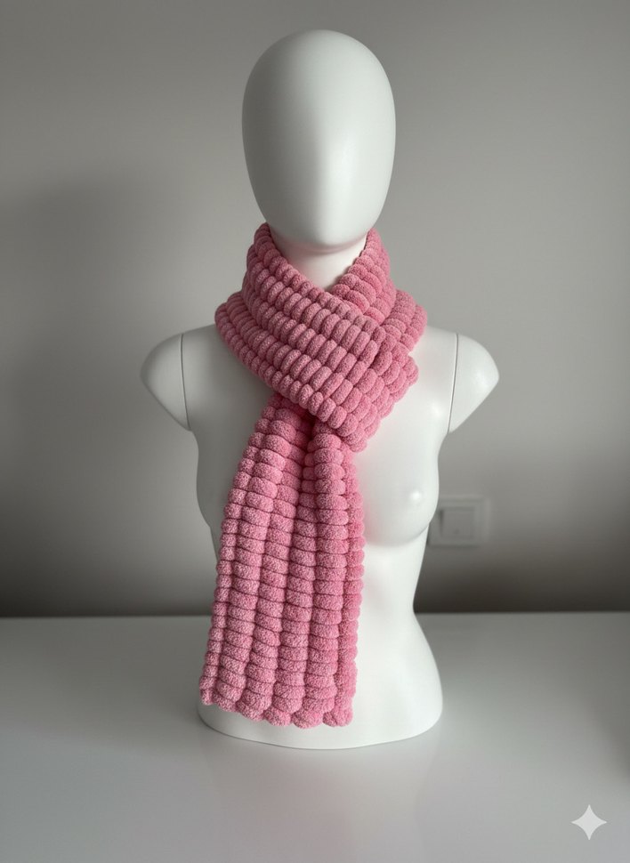 Pastel pembe renkte, yumuşak dokulu örgü kadın şalı. Rahat ve şık normcore tarzıyla trend belirleyiciler için ideal.