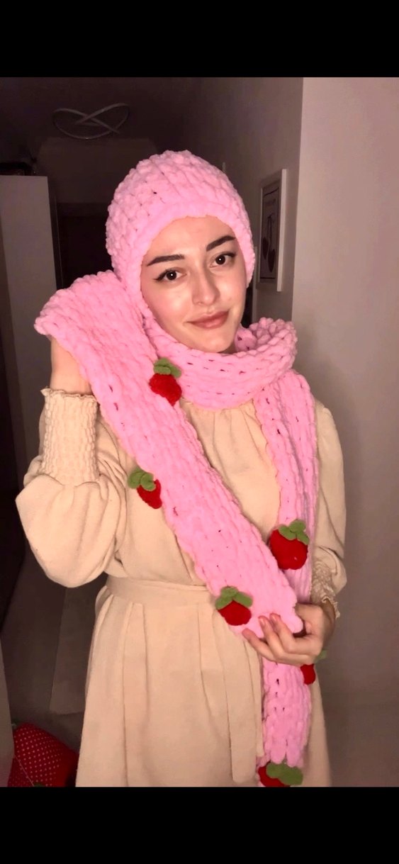 Pembe örgü kadın şal ve bere seti, küçük kırmızı kiraz detaylarıyla rahat ve bohem tarzda sıcak tutar.