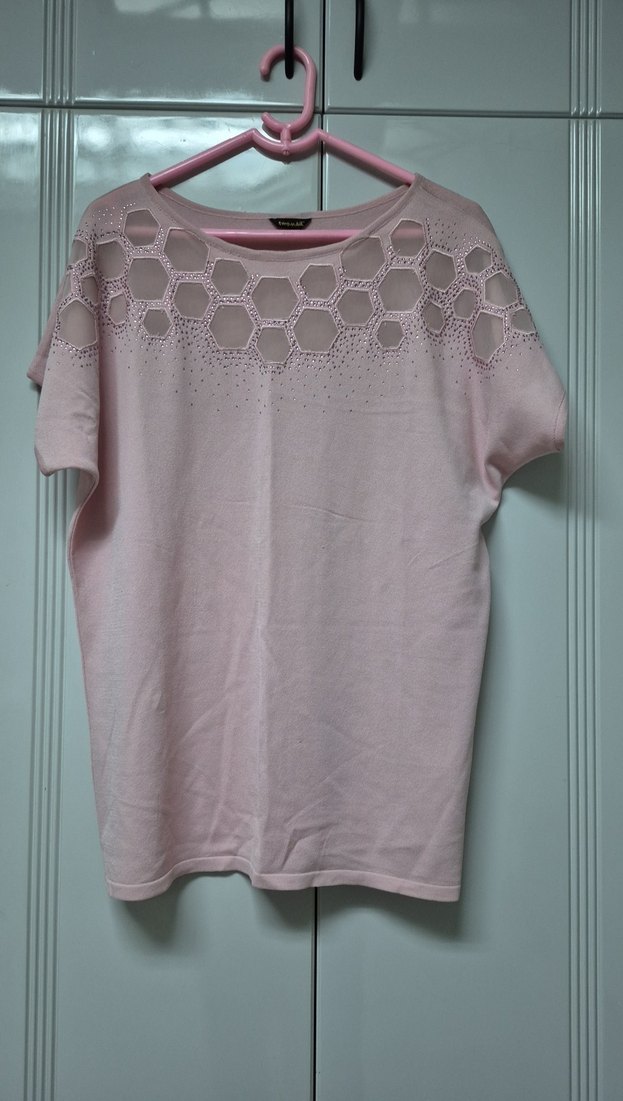 Pastel pembe renkte, kısa kollu ve yuvarlak yakalı örgü kadın tişört. Üst kısmında altıgen desenli kesikler bulunur. Rahat kesim ve normal boydadır. ✨