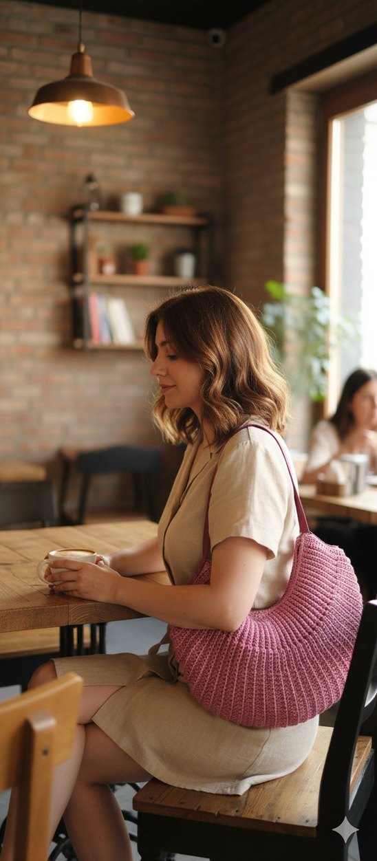 Kadınlar için pembe tonlarında, örgü kumaştan yapılmış, kabarık dokulu ve baskılı desenli günlük kullanıma uygun tote çanta. Polyester makrome ile örülmüştür, içi astarlı ve ceplidir. İlk görsel yapay zeka ile oluşturulmuştur.