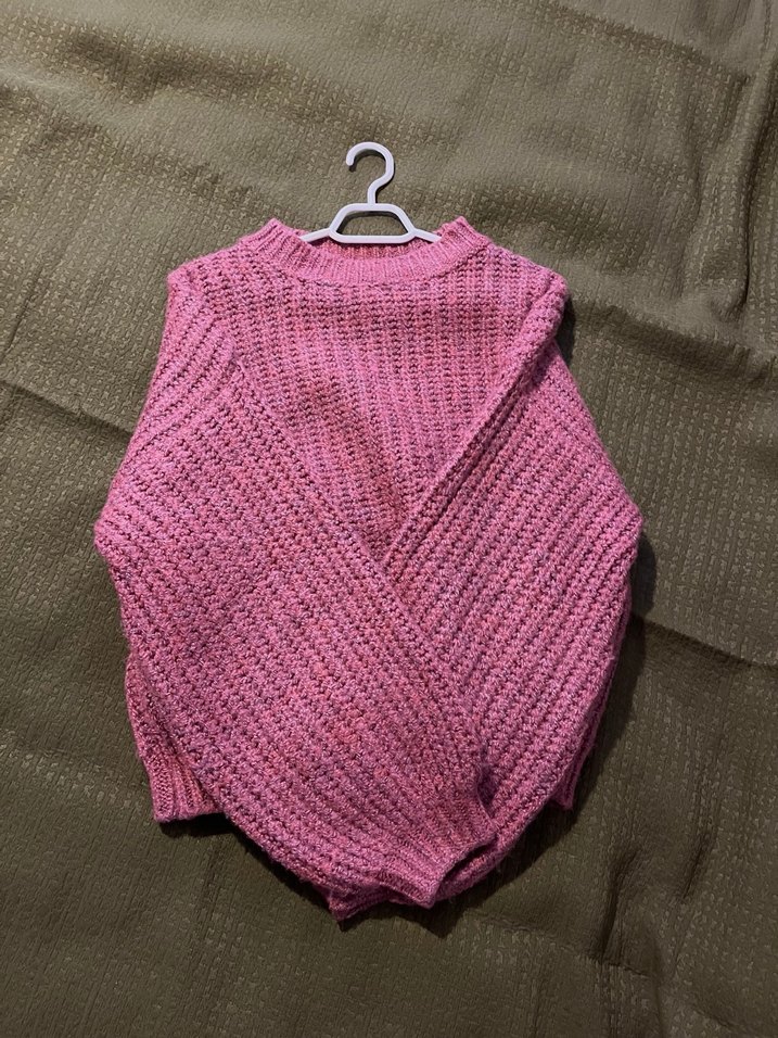 Yumuşak triko kumaştan, uzun kollu, yuvarlak yakalı, bol kesim pembe örgü kadın kazak. Etiketini kaşındırdığı için sanırım kesmiiim.