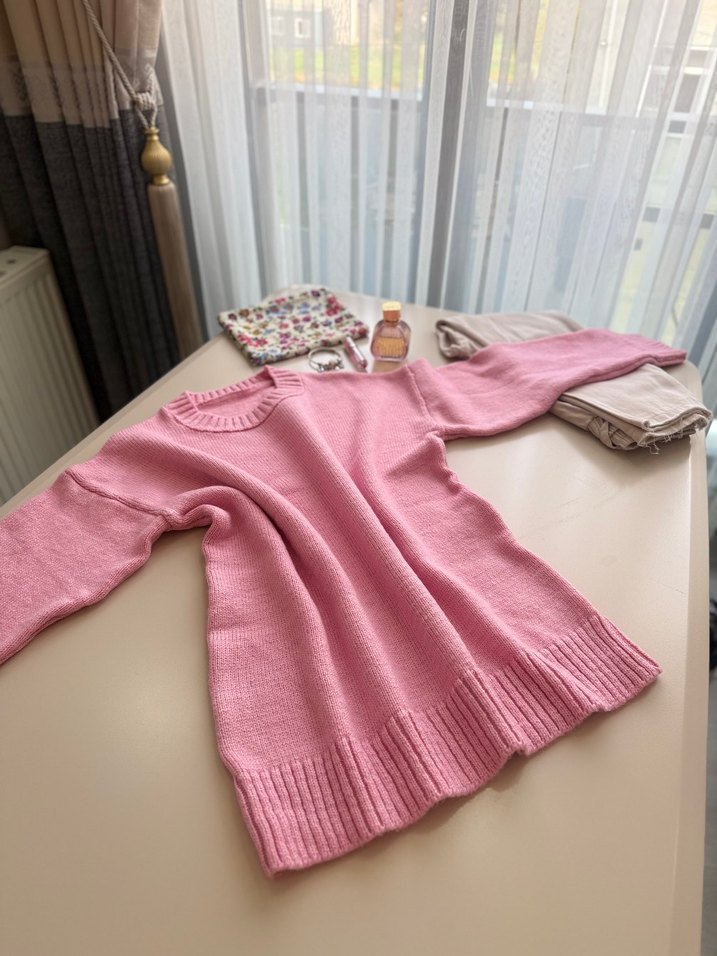 Pembe örgü kadın triko kazak, bol kesim, uzun kollu ve yuvarlak yaka detaylarına sahiptir. Normal midi boyu ve sade deseniyle günlük kullanıma uygundur.