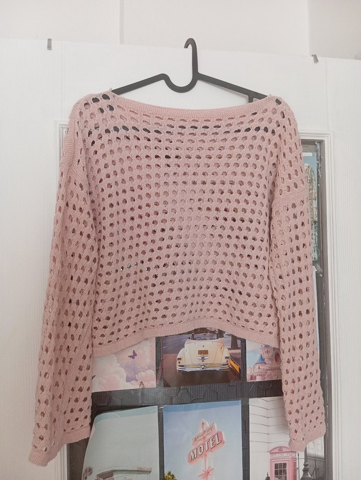 Pastel pembe renkte, uzun kollu, tek renk örgü triko kazak. Salaş kesimi ve kayık yaka detayı ile rahat ve bohem tarzda. çok az giyildi
