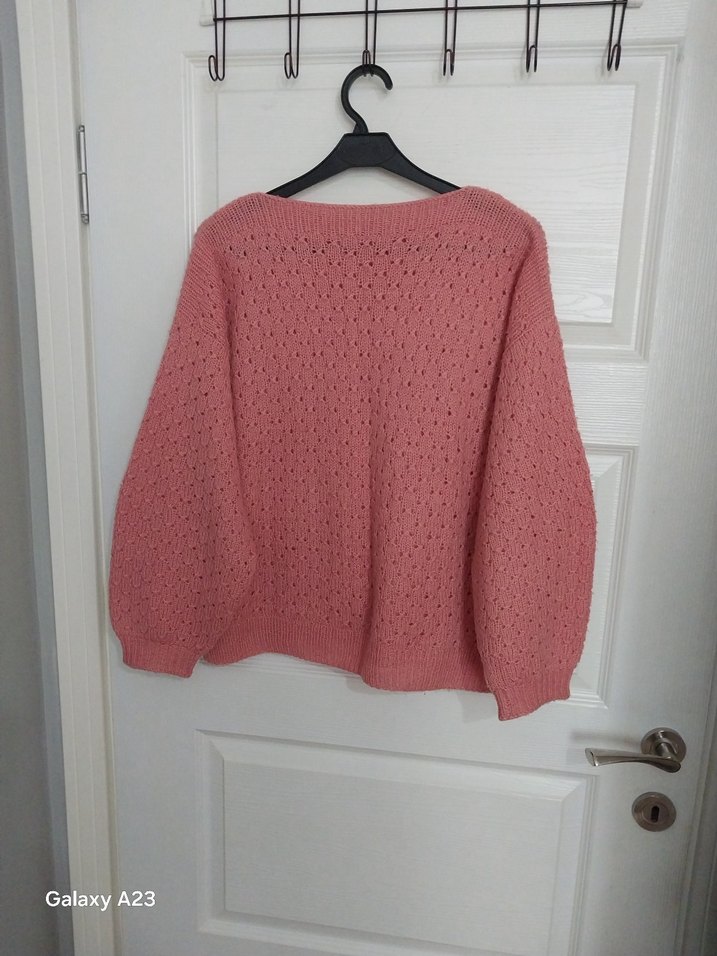 Pembe renkli, örgü triko kazak, uzun kollu ve yuvarlak yaka. Rahat kesimi ve sade tasarımıyla günlük kullanıma uygundur.