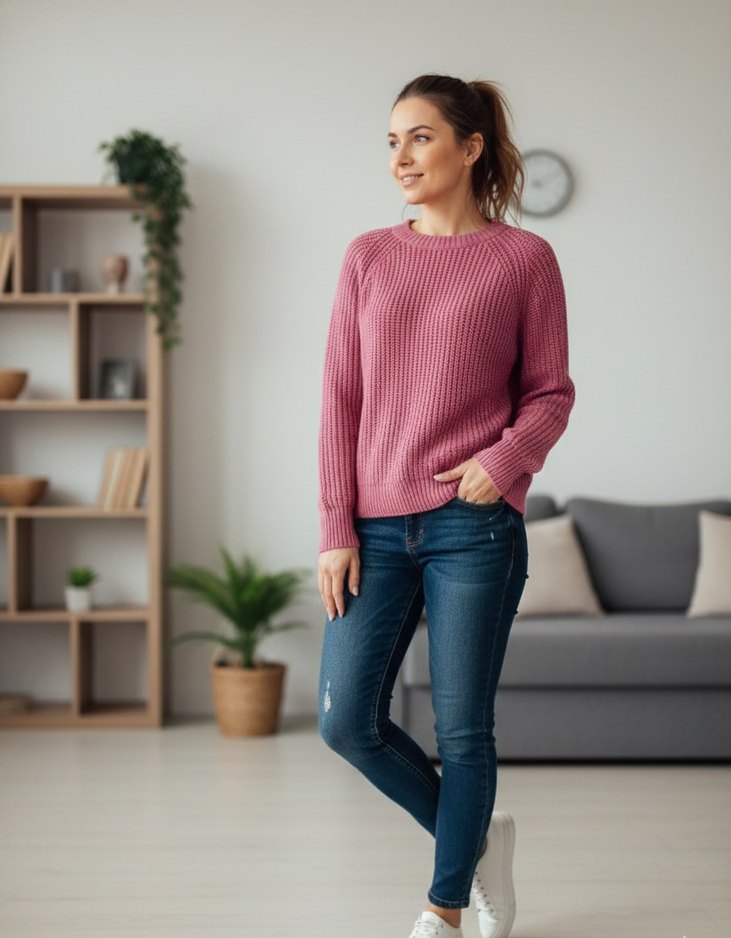 Pembe renkli, uzun kollu, yuvarlak yakalı, rahat kesim örgü kadın triko kazak, günlük kullanım için uygundur. S M L bedenlere uygundur