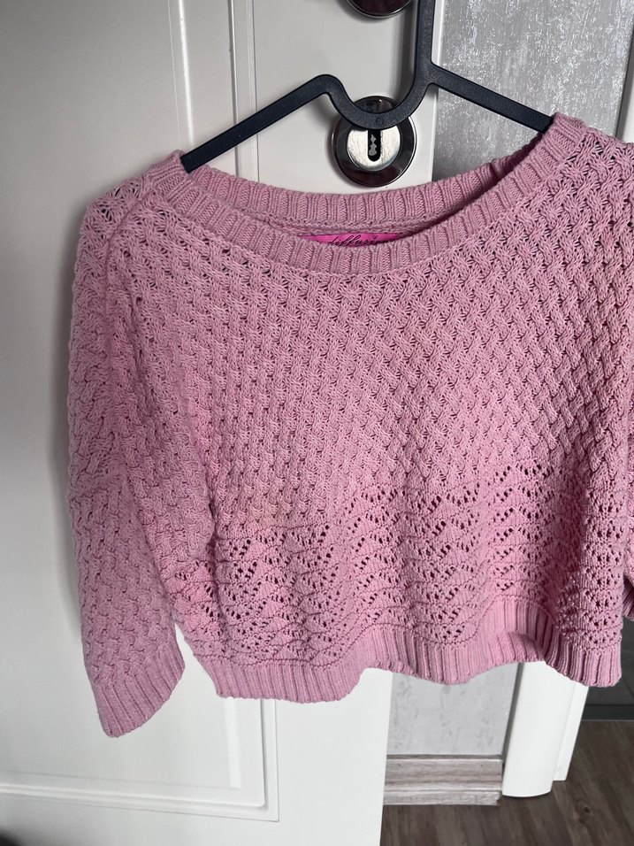 Pembe renkli, yuvarlak yakalı ve uzun kollu örgü triko kazak, rahat ve bol kesimdir. Pastel tonlarda sade tasarımıyla günlük kullanıma uygundur.