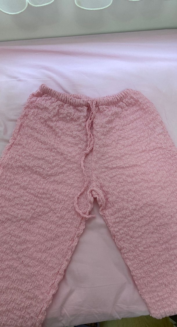 Yumuşak triko kumaştan, bol kesim, midi boy pembe örgü kadın pantolon. Rahat ve sade tarzda, günlük kullanıma uygundur.