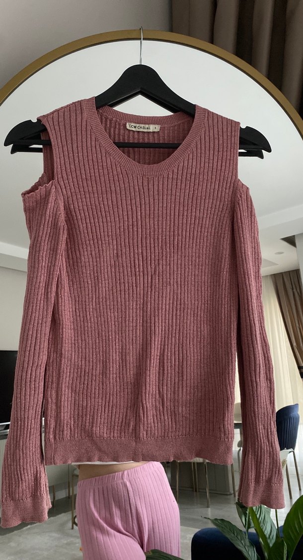 Pembe renkli, uzun kollu, yuvarlak yaka ve örgü kumaştan yapılmış, normal boyda, rahat kesim kadın kazak. Simli