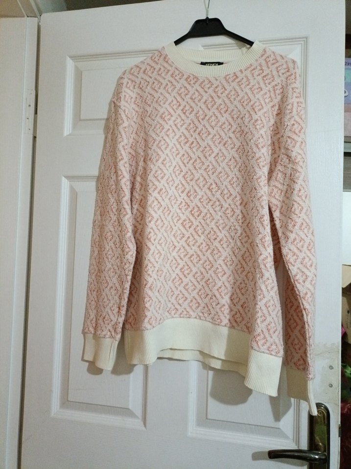 Pastel pembe renkte, uzun kollu, salaş kesim, yuvarlak yakalı kadın örgü kazak. Günlük kullanım için uygun, midi boyda ve rahat bir dokusu var.