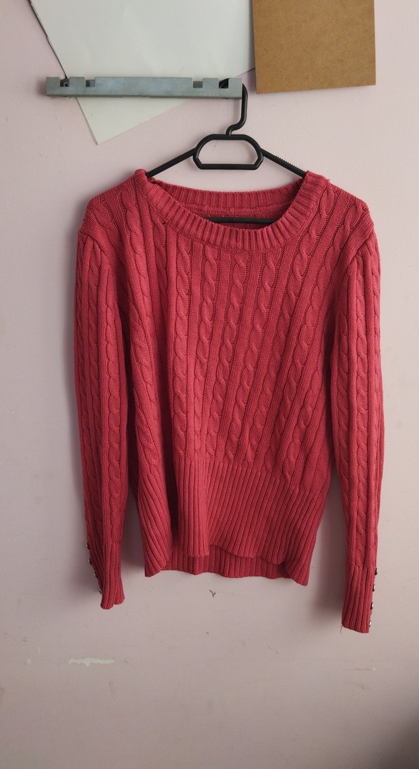 pembe örgü triko, yuvarlak yaka ve uzun kollu, bol kesim ile rahat sokak stili için uygundur. Normal midi boyda, desen içermeyen rahat bir modeldir.