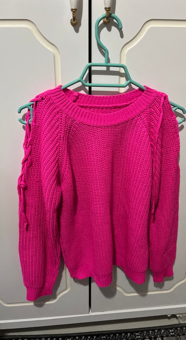 Pembe renkli, yuvarlak yakalı ve uzun kollu örgü kadın kazak. Rahat ve bol kesimiyle günlük sokak stiline uygun, desensiz ve canlı renkli.
