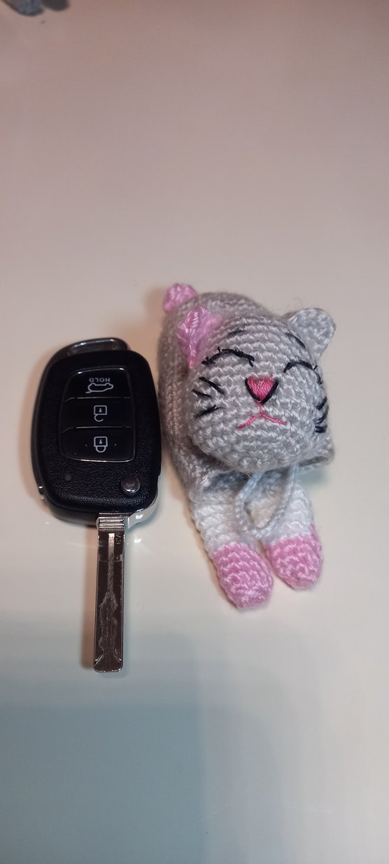Araba tutkunları ıcin Pembe detaylara sahip örgü kedi amigurami anahtarlık, Anahtarlik sıfırdır satış için örülmüştür.