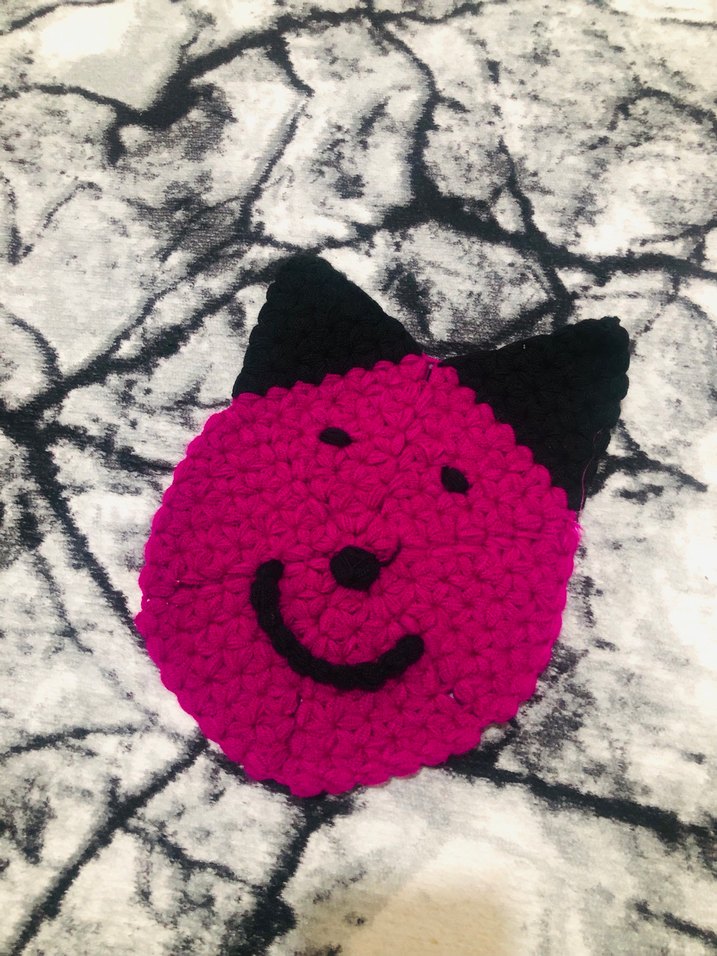 Yumuşak iplikten örülmüş, siyah kulaklı ve gülümseyen yüzlü pembe örgü kedi lif