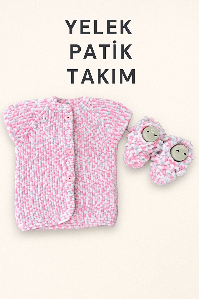 Pembe örgü kız bebek kısa kollu yelek ve patik takımı, yumuşak ve rahat dokusu ile bebekler için uygundur.
