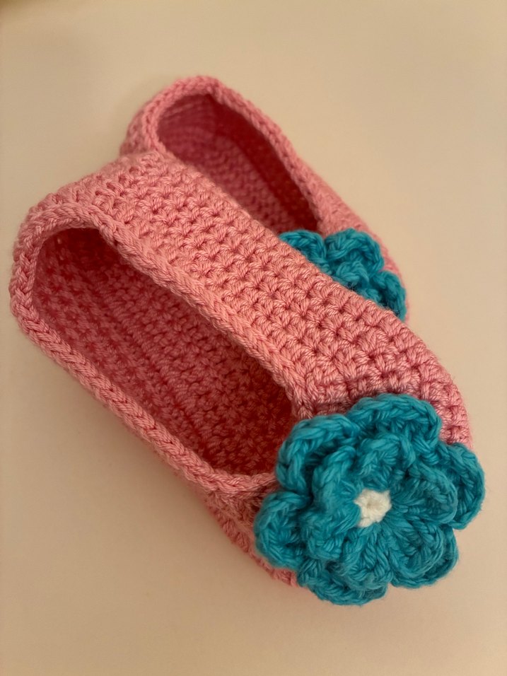 Pembe renkli örgü kız bebek patikleri, üstünde turkuaz renkli çiçek detayı ile sade ve renkli bohem tarz sunar.