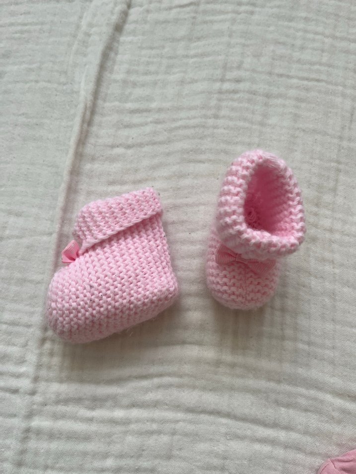 Yumuşak pastel pembe renkte, düz ve klasik tasarımlı örgü kız bebek patik. Küçük ayaklar için rahat ve sıcak tutar.