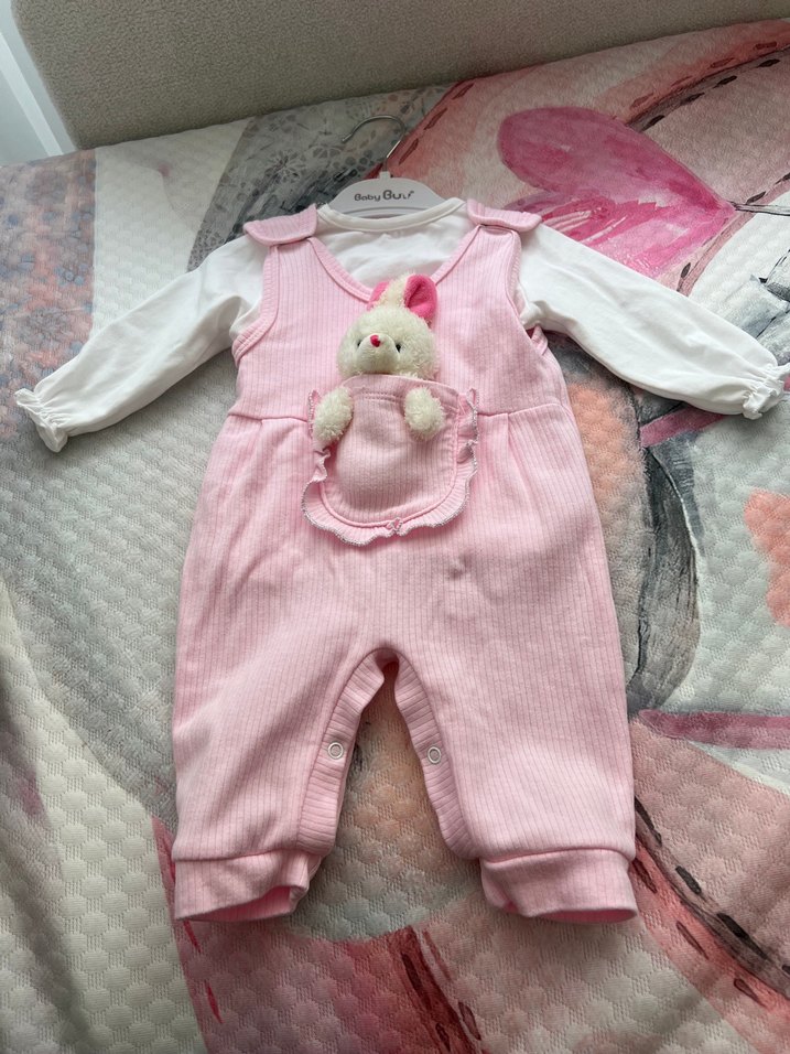 Pastel pembe renkli, örgü kumaştan yapılmış kız bebek tulumu, sevimli tavşan cepli tasarıma sahiptir. Rahat ve şık bir seçimdir.