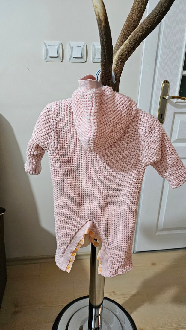 Pastel pembe renkli, kapüşonlu ve uzun kollu örgü kız bebek tulumu. heryeri çıtçıtlı . için polarlı dışı triko. sıcacık tutuyor. resimde gözüktüğü gibi. hafif tüylenme var ama tüy toplama makinesiyle alınır tertemiz olur