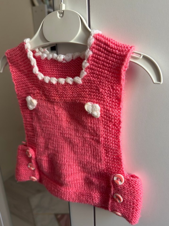 Pembe renkli, örgü kız bebek tulumu, beyaz süslemeler ve düğme detaylarıyla yumuşak ve renkli bir tasarıma sahiptir. Hiç giyilmedi.