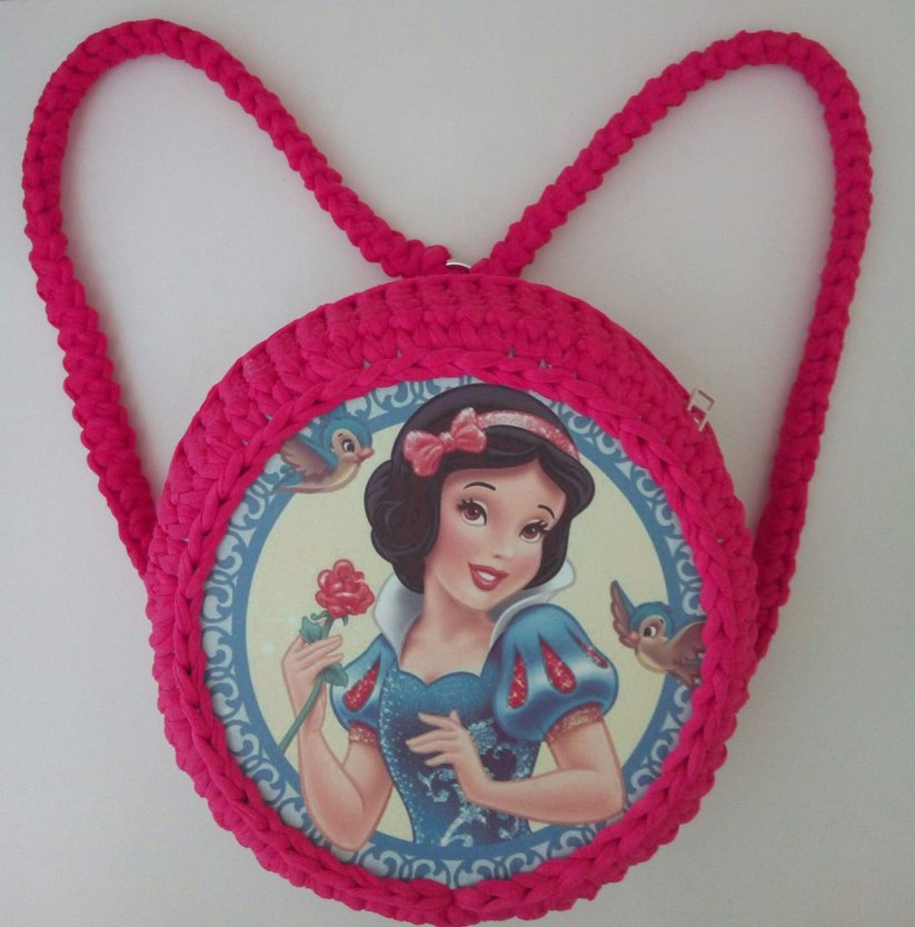 Canlı renklerde, örgü pembe çanta, pop kültür desenli klasik prenses figürüyle bohem ve retro tarzlar için uygun.temsili marka.