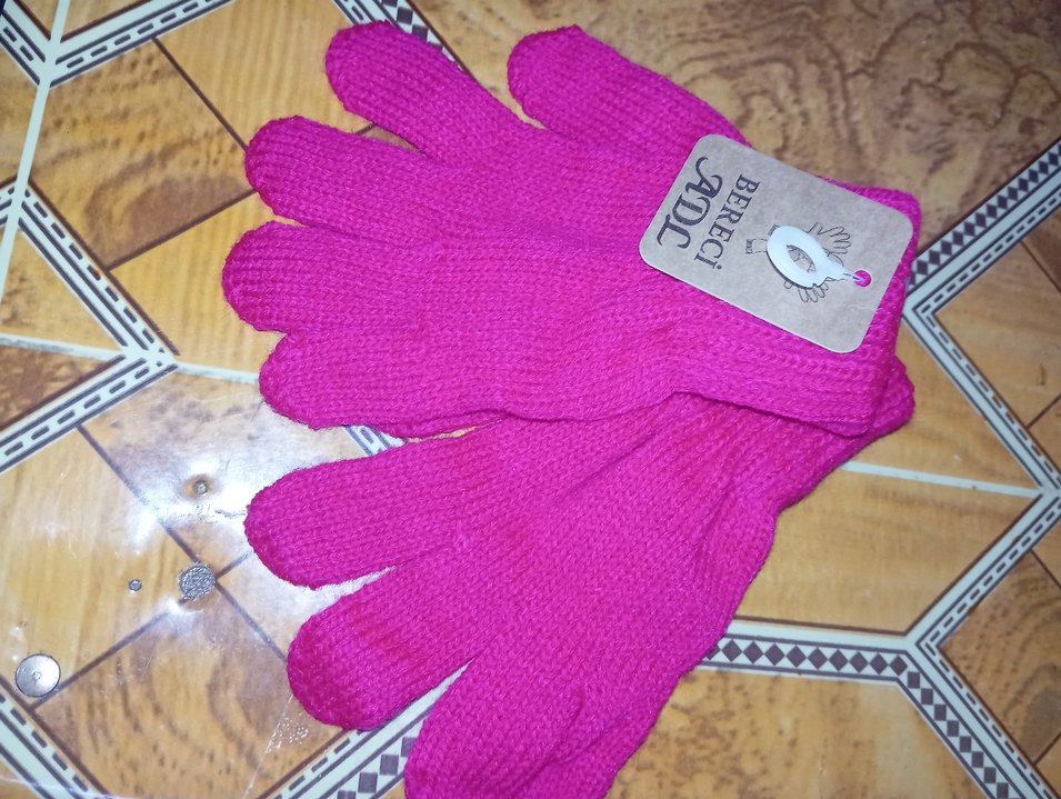 Yumuşak örgü kumaştan yapılmış, canlı pembe renkte kız çocuk eldivenleri. Rahat ve bohem tarzda, sade ve kullanışlıdır.