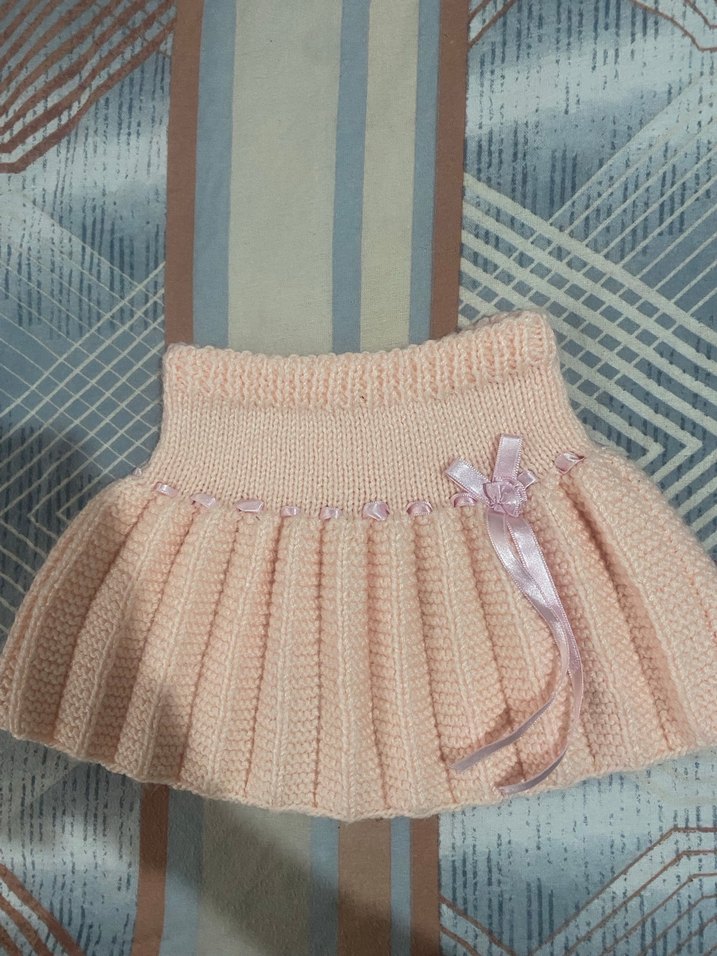 Pembe renkli, örgü kumaştan yapılmış, bol kesim ve bohem tarzında kız çocuk eteği. İnce kurdele fiyonk süslemelidir.