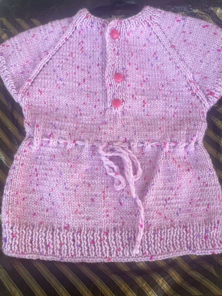Pembe renkli, örgü kız çocuk hırkası, bohem tarzda, askılı kollu ve belde bağlama detayına sahiptir.