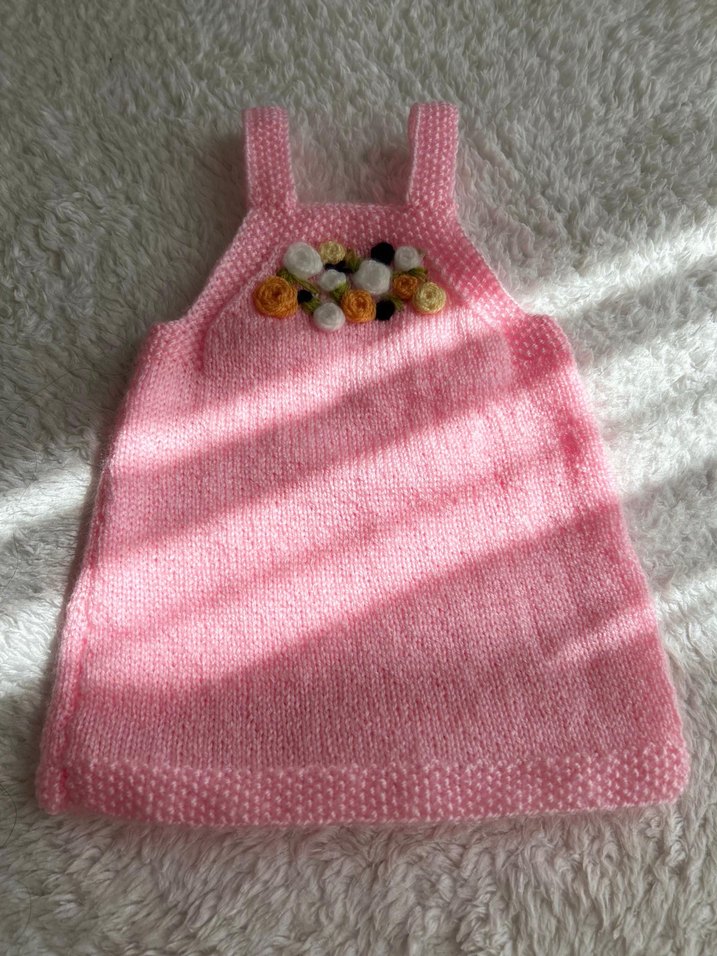 Pembe renkli, kolsuz ve yuvarlak yaka örgü kız çocuk süveter. Göğüs kısmında çiçek detaylı el örgüsü arkadaşlar 2 yaşına kadar giydirlebilir